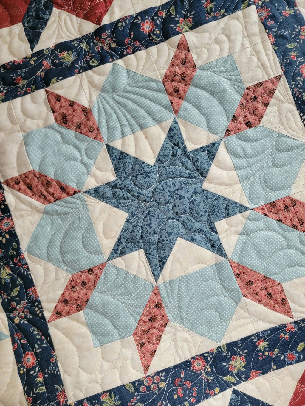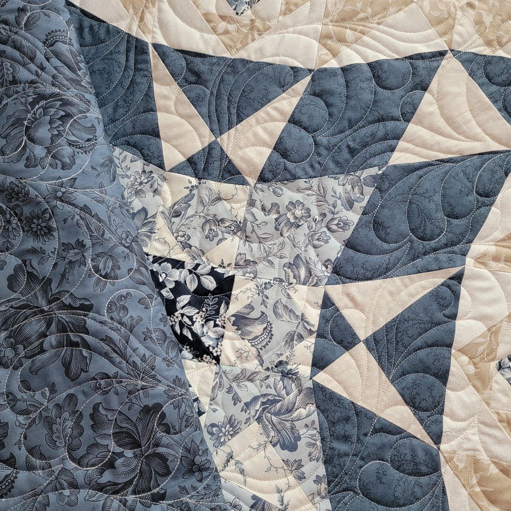 I am blessed to make my love of a quilting a full-time gig. I offer longarm quilting services, binding services, and custom embroidered quilt labels. I quilt on my 12 foot Gammill Statler longarm which means I can quilt king sized quilts. It is computerized which allows me to take any of the digital designs and quilt them as dense or open based on your taste and the quilt. There as probably as many quilting designs as there are stars in the sky. If you have something in mind and I don't have a design that will work, I'll search and find the appropriate design.
